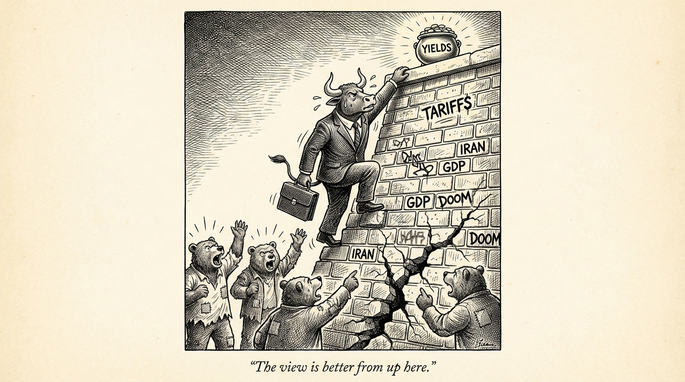 The market is climbing a classic 'Wall of Worry,' shrugging off US-Iran tensions and new 15% global tariffs to push higher. While headlines are negative, credit markets remain incredibly calm, signaling that institutional capital sees these threats as noise rather than systemic risks. Investors are favoring quality small-caps and M&A targets over broad index exposure.