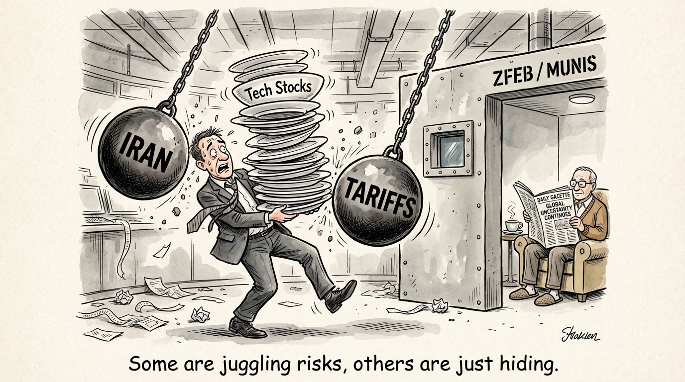 Markets slammed into a defensive crouch today as a 'Double Threat' of escalating tensions with Iran and new global tariffs triggered a sharp sell-off. Volatility spiked significantly as capital fled speculative tech names for the safety of bonds, gold, and defined-protection structures. The rotation was decisive: investors are dumping growth for guaranteed durability.