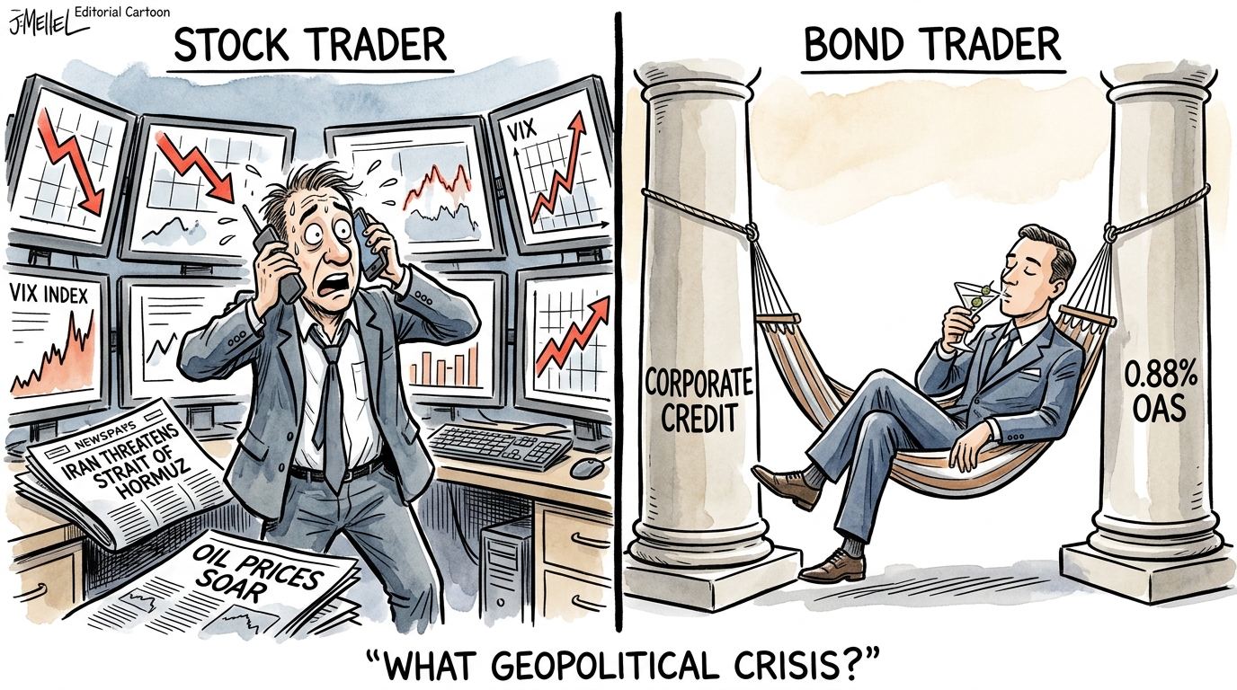 The VIX expansion versus credit compression is the most critical mechanism in the market today. The VIX surged +2.7 points to 26.8, a level that typically accompanies severe market stress, forced liquidations, and broad institutional de-risking. However, High Yield OAS spreads actually compressed by -0.02% to a remarkably low 0.88%, a level indicative of pristine liquidity and high risk appetite in the bond market. This mechanism shows that the fear is entirely headline-driven rather than structural; if the banking system, corporate earnings, or global trade were truly at risk of a systemic freeze, credit spreads would be blowing out aggressively alongside equity volatility. The bond market is essentially calling the equity market's bluff. The invalidation for this bullish divergence would be a sudden, sustained spike in OAS spreads significantly above current levels, which would signal that the geopolitical shock has finally infected the credit plumbing.